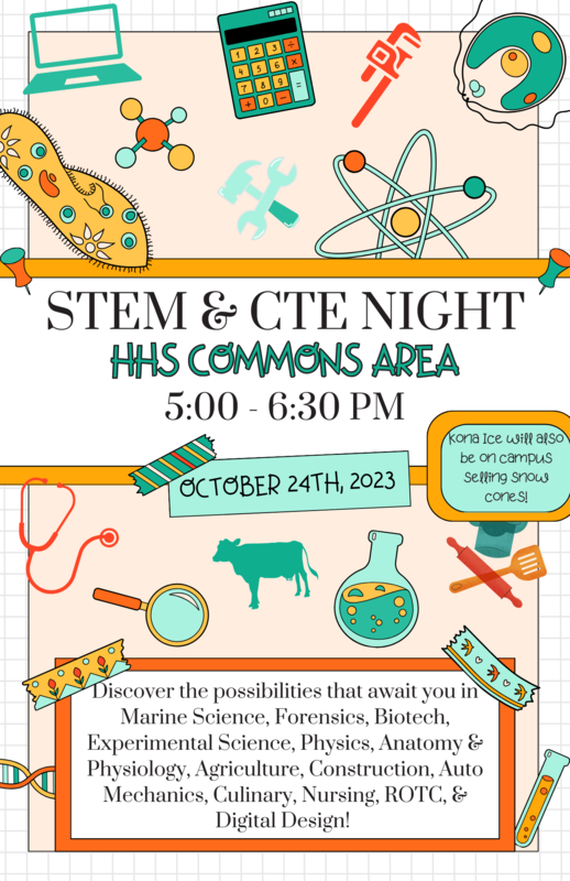 On 10/24/23 Hardee Senior High School will be hosting a STEM & CTE night! HSH is inviting Hardee Junior High School students, 6th through 8th graders, to attend as we feel this is an excellent opportunity to see what we have to offer and set some goals for their future. The students and their parents who attend will do a self-paced tour through the commons and into the culinary lab and ROTC room exploring what we have to offer. The programs that we will be showcasing are Marine Science, Experimental Science, Forensics, Biotechnology, Anatomy and physiology, Physics, Agriculture/FFA, Auto Mechanics, Building Construction/Drafting, Nursing, Culinary, ROTC, and Digital Design. We will also have our Robotics Team, Solar Go-Kart Team, and Alpha Zeta Pi (our STEM Club) set up with information about those programs.